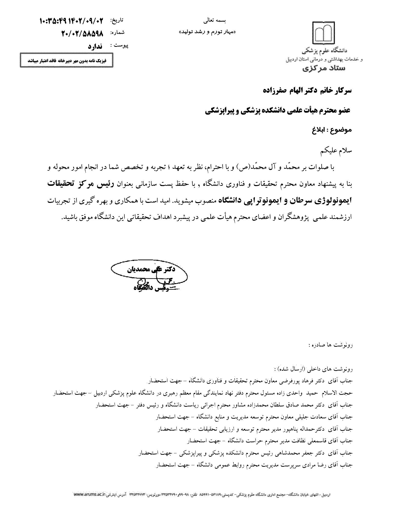 رئیس مرکز تحقیقات ایمونولوژی سرطان و ایمونوتراپی دانشگاه منصوب شد.