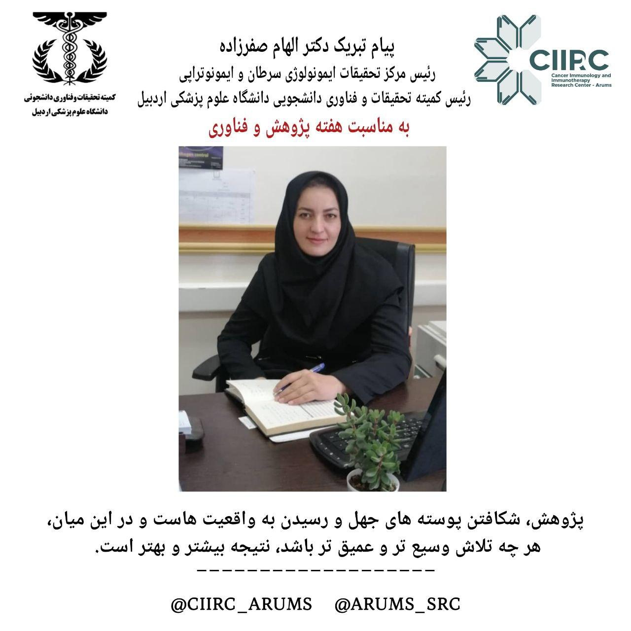 پیام تبریک دکتر الهام صفرزاده رئیس مرکز تحقیقات ایمونولوژی سرطان و ایمونوتراپی و رئیس کمیته تحقیقات و فناوری دانشجویی دانشگاه علوم پزشکی اردبیل به مناسبت هفته پژوهش و فناوری