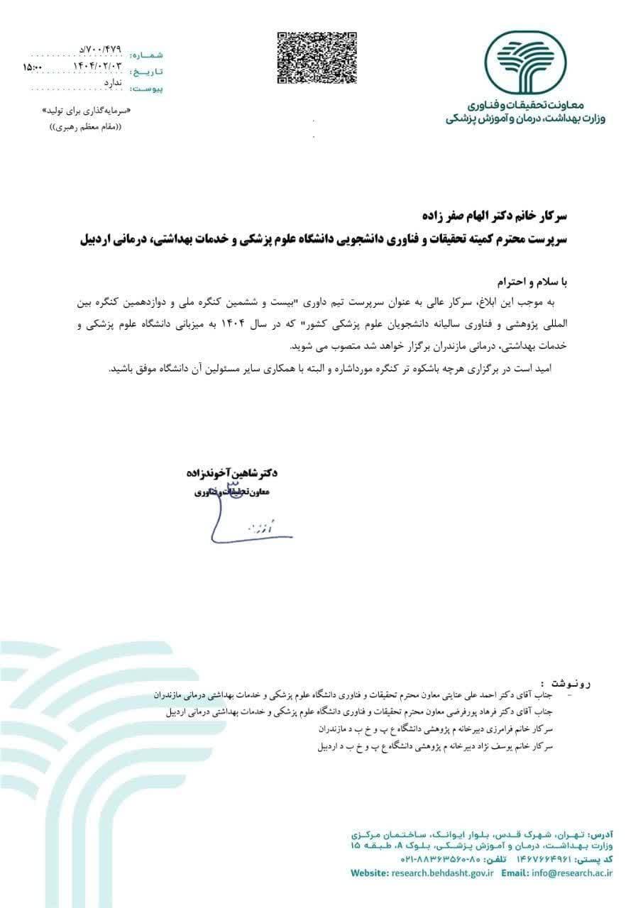طی حکمی از سوی دکتر شاهین آخوندزاده، معاون تحقیقات و فناوری وزیر بهداشت، خانم دکتر الهام صفرزاده، رئیس مرکز تحقیقات ایمونولوژی سرطان و ایمونوتراپی و رئیس کمیته تحقیقات و فناوری دانشجویی دانشگاه علوم پزشکی اردبیل به عنوان ﺳﺮﭘﺮﺳﺖ ﺗﯿﻢ ﺩﺍﻭﺭﯼ ﺑﯿﺴﺖ ﻭ ﺷﺸﻤﯿﻦ ﮐﻨﮕﺮﻩ ﻣﻠﯽ ﻭ ﺩﻭﺍﺯﺩﻫﻤﯿﻦ ﮐﻨﮕﺮﻩ ﺑﯿﻦ ﺍﻟﻤﻠﻠﯽ ﭘﮋﻭﻫﺸﯽ ﻭ ﻓﻨﺎﻭﺭﯼ ﺳﺎﻟﯿﺎﻧﻪ ﺩﺍﻧﺸﺠﻮﯾﺎﻥ ﻋﻠﻮﻡ ﭘﺰﺷﮑﯽ ﮐﺸﻮﺭ منصوب شد. گفتنی است این کنگره در سال ۱۴۰۴ به میزبانی دانشگاه علوم پزشکی مازندران برگزار خواهد شد.